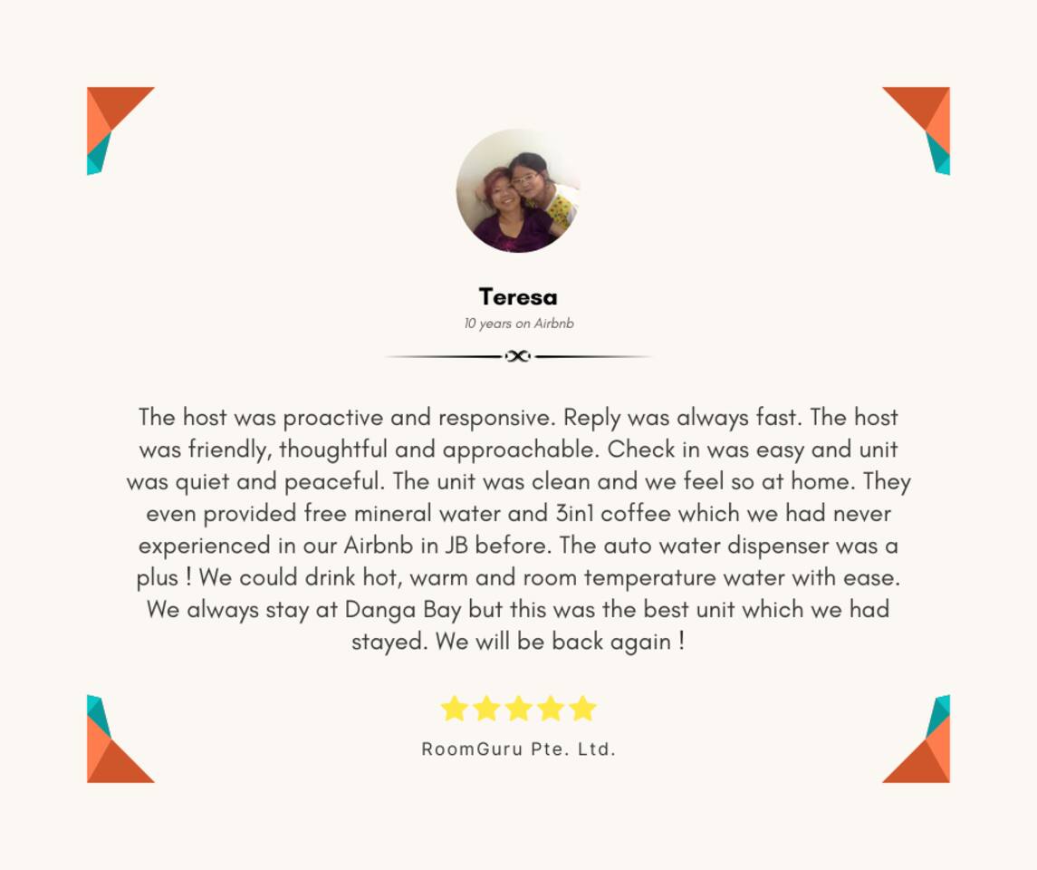 Get ready for a super cool stay at our place! 1. Just around the corner, there's Danga Bay Beach. It's the perfect spot for chilling out and catching a gorgeous sunset. Trust me, you'll want to take loads of photos. 2. Legoland Malaysia is only a hop, skip, and a jump away. It's great fun, not just for kids but for adults too. You’ll love all the cool Lego stuff. 3. For a taste of local life, head to Jalan Trus. It’s the place for fantastic food, neat little shops, and a slice of the area's history. 4. Animal lovers, get ready for a treat at Johor Zoo. You'll find a variety of cute and wild animals, including tiger cubs and elephants. It's a fantastic way to spend your day. 5. If shopping is more your style, we've got Country Garden Danga Bay Mall. It's full of shops, food, and all the good stuff. Our neighbourhood has it all: beaches, theme parks, vibrant streets, wildlife, and shopping. We can’t wait for you to come and experience it for yourself!