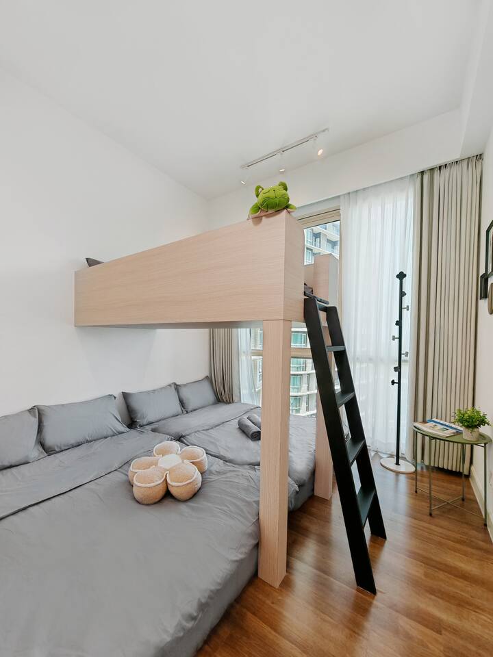 Welcome to Sleep Sandwich! It's a playful, comfy setup perfect for families. We’ve got a giant bed below, a bunk on top, and no bedtime fights in sight ^^ Just 2–3 mins walk to Legoland (literally the nearest stay you’ll find), plus a cosy living space, Netflix, and a kitchen. It’s simple, clean, and made for laughs, naps, and easy mornings. Come stay where the fun begins!