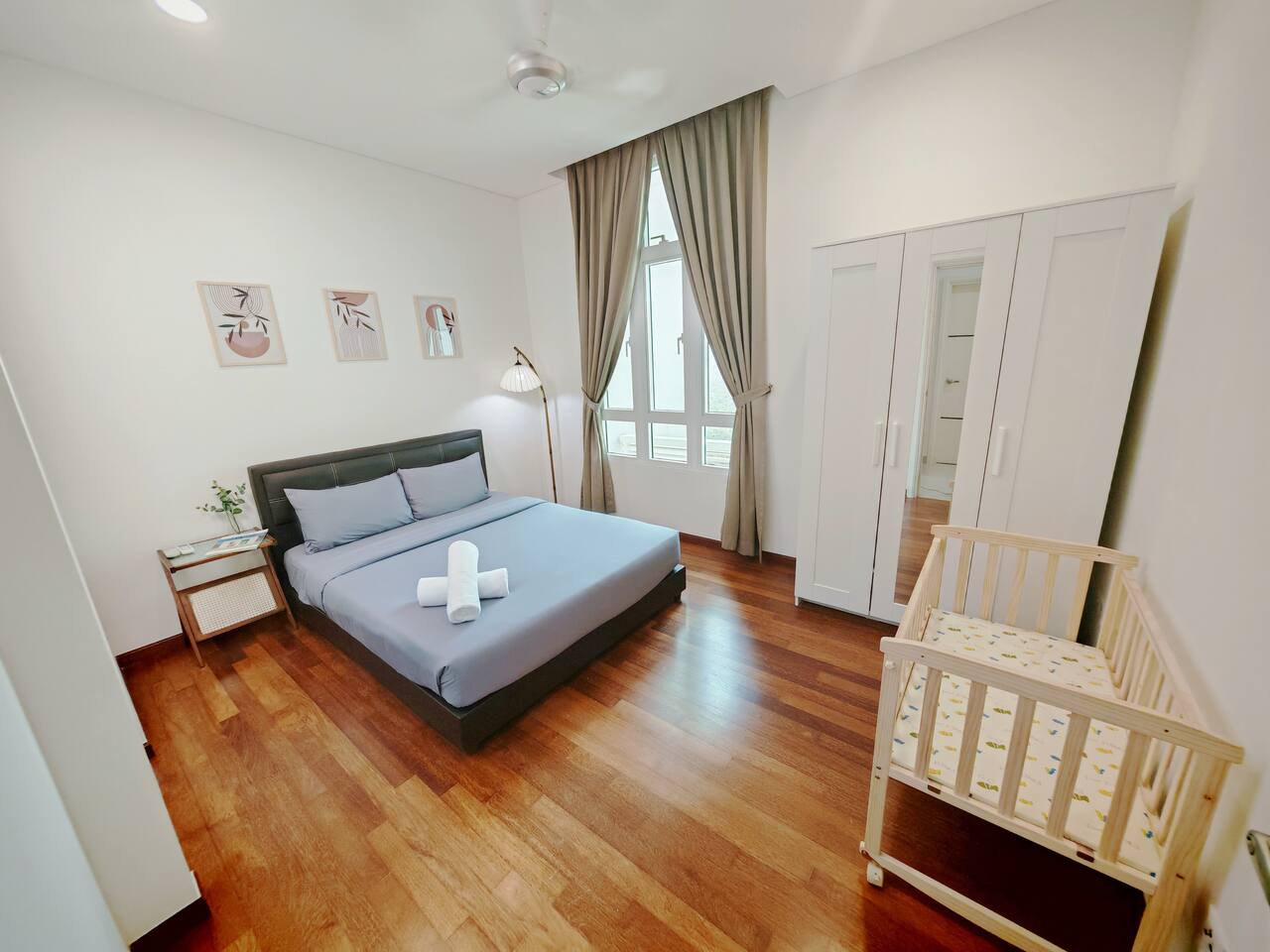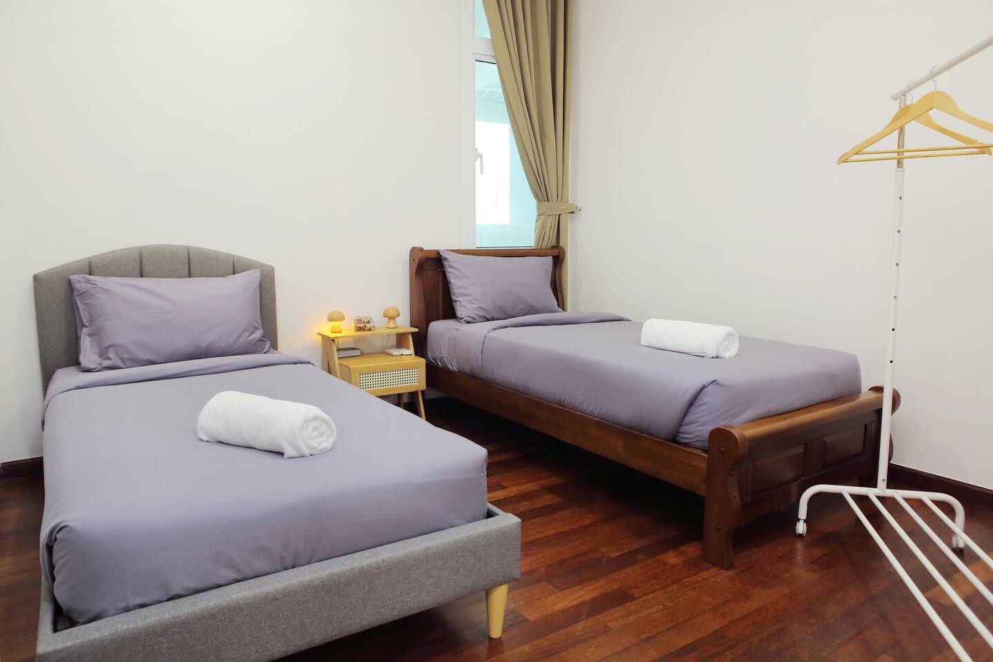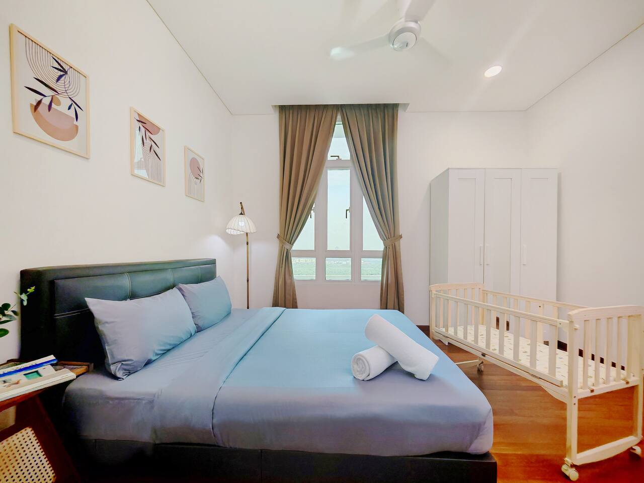 Family-friendly 2BR on the 16th floor ... just a 3-min drive to Legoland. Clean, comfy and practical with a full kitchen, fast Wi-Fi, AC and a washer. Master has a queen; second room has two singles; baby cot available. Resort perks downstairs: pools, gym, playground and gardens. Lift access and 1 free indoor parking. Grab rides are easy, cafes. Simple stay, smooth check-in... message us if you need a high chair or late checkout.