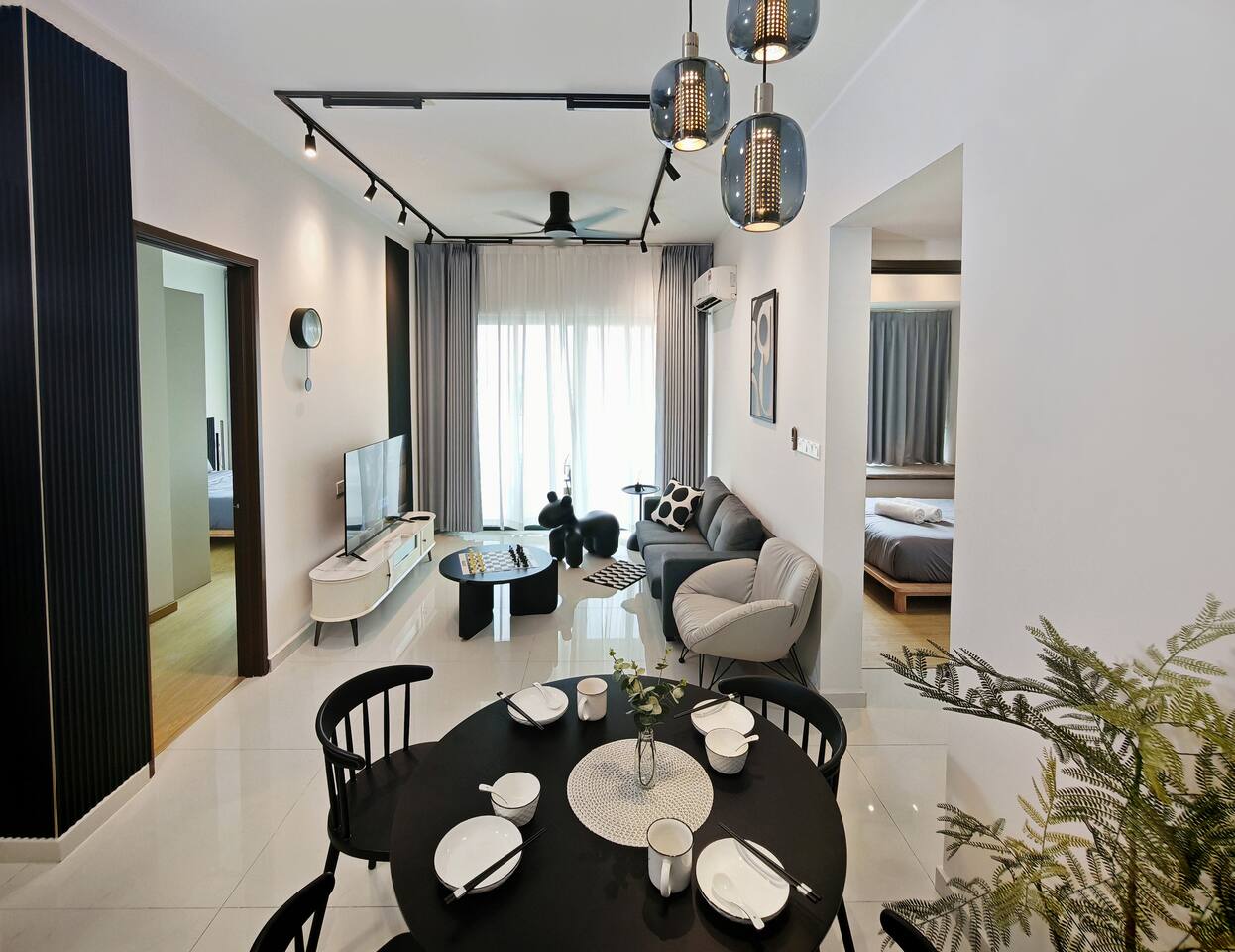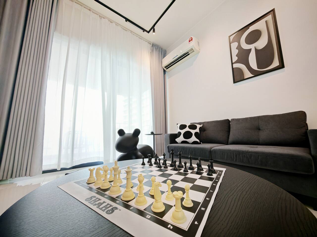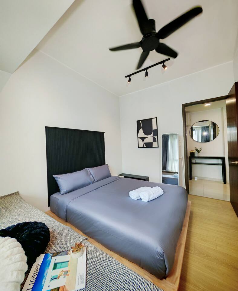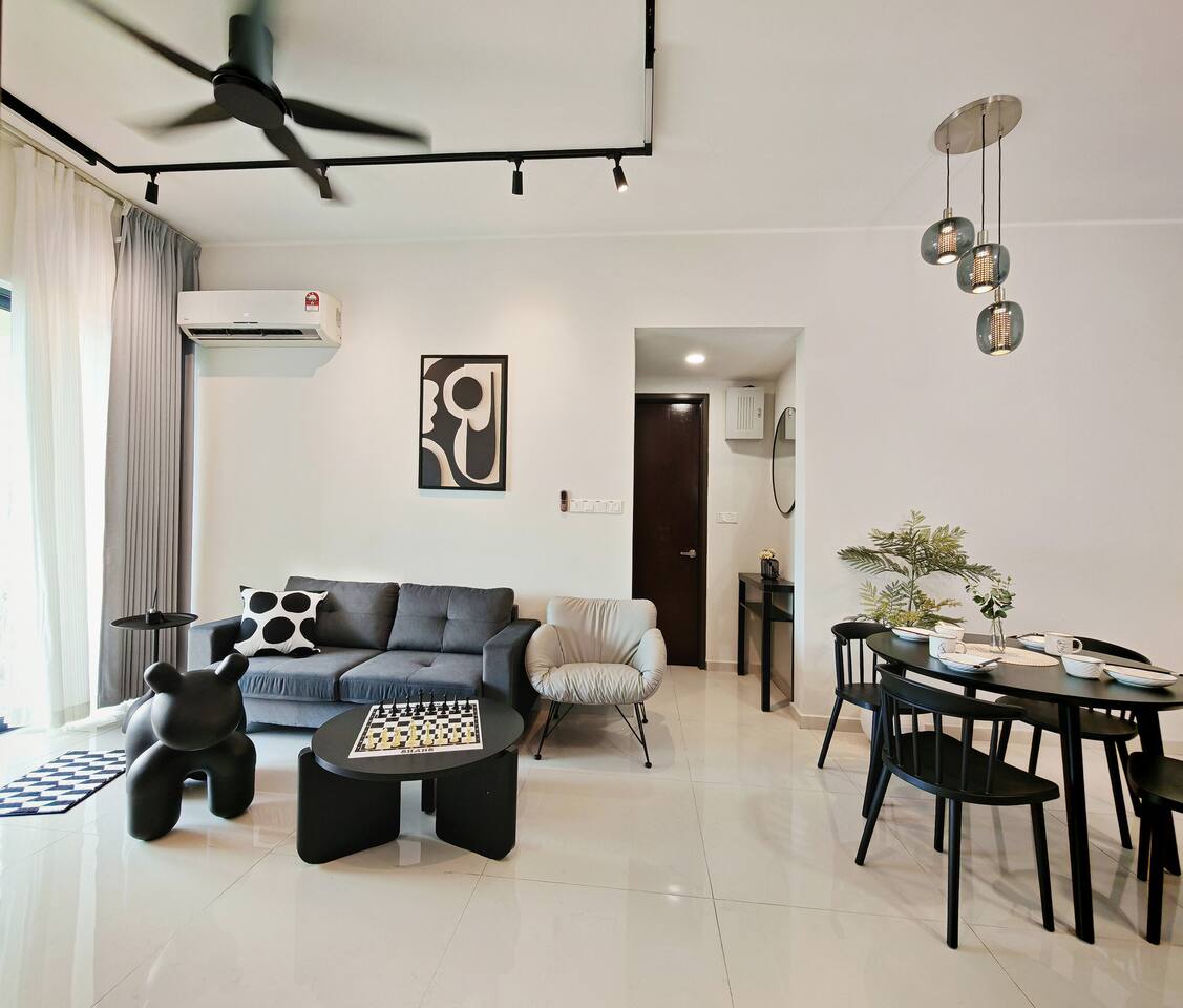 This 2-bedroom, 2-bathroom home in Country Garden Danga Bay is styled in black and white, inspired by MJ’s famous song "Black or White" as a little tribute to him :) It’s cosy, clean and full of character. You’ll find comfy beds, a full kitchen, a nice sofa to chill on, and even a little chess corner. Just 2 minutes walk from the beach, it’s a great spot for couples, families or anyone looking for a relaxing escape!