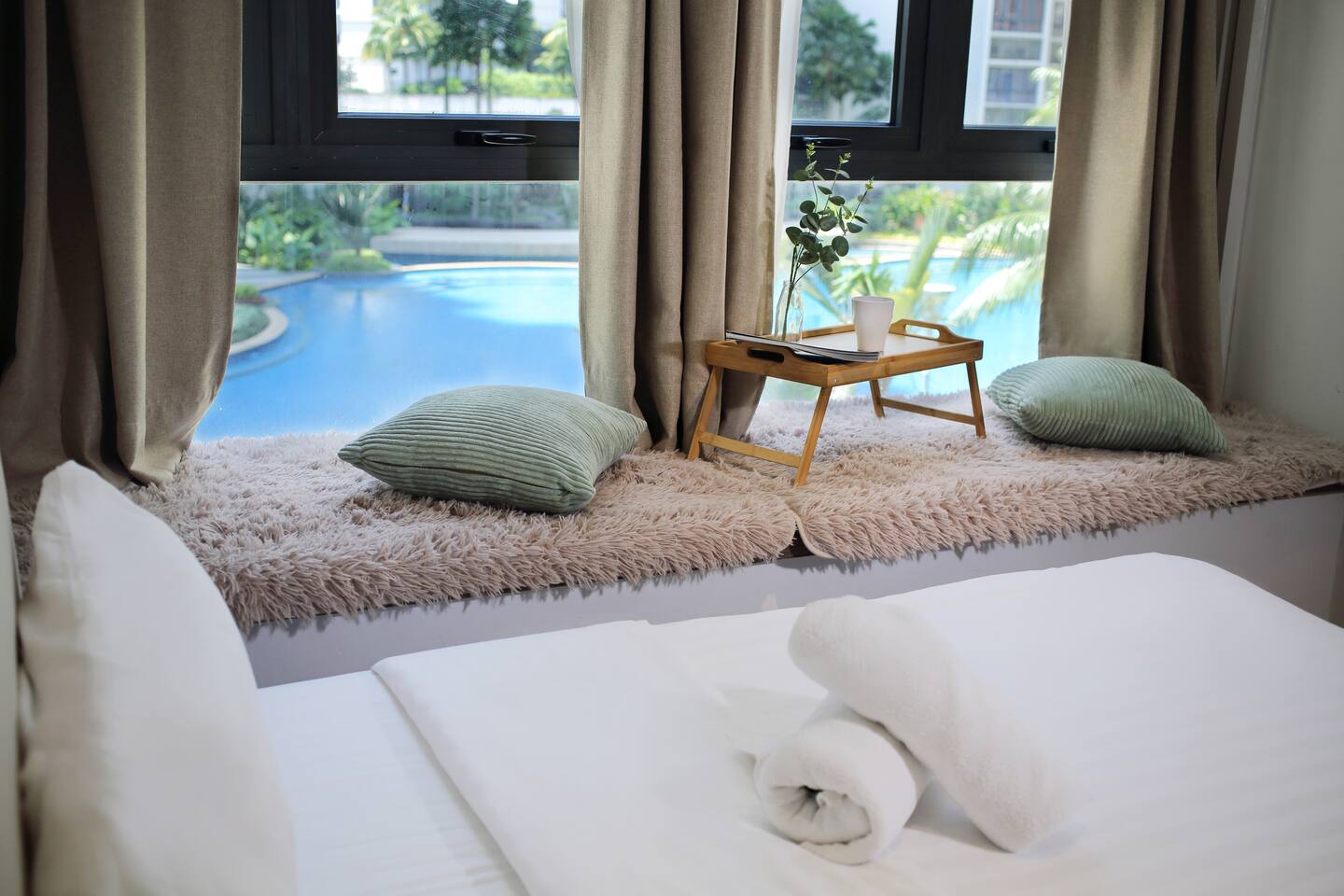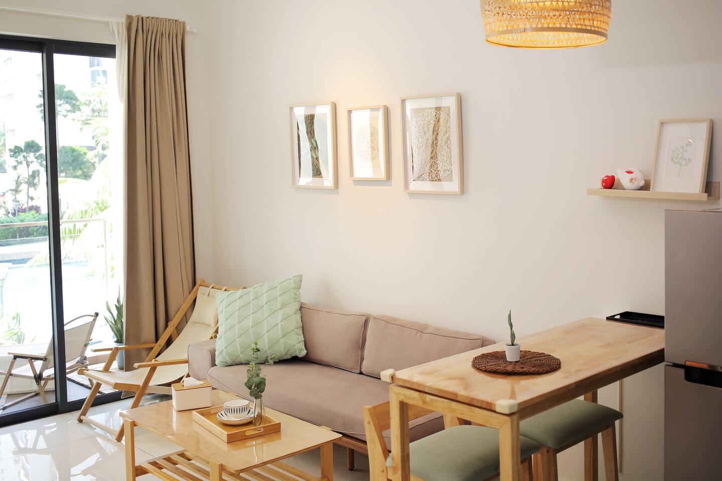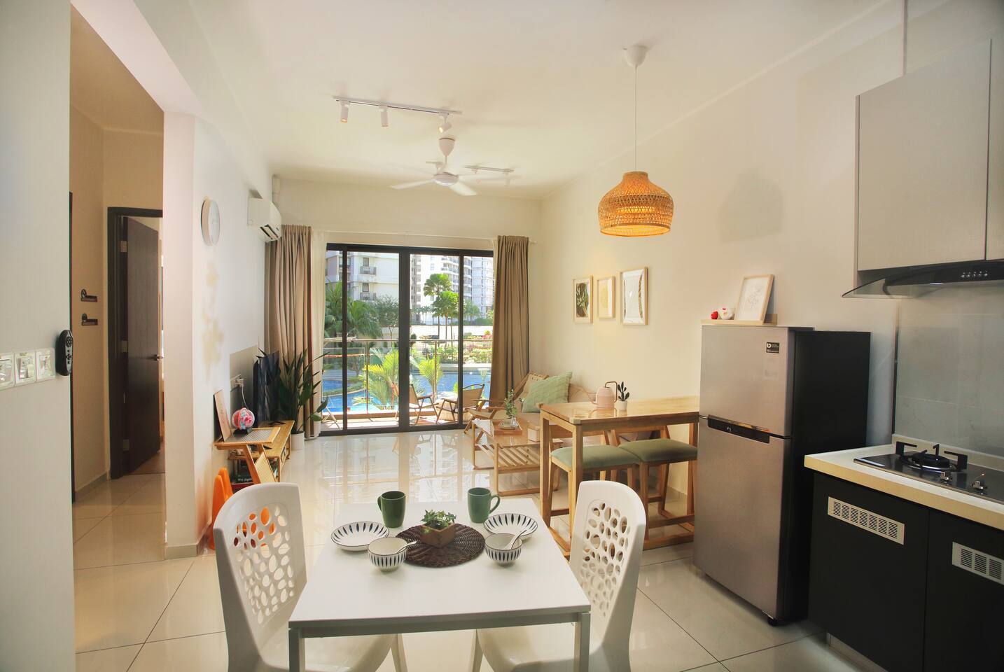 1. Relax under the tropical sun from your private balcony, gazing at lush gardens and a shimmering pool - the idyllic beginning to any day in paradise. 2. Step inside to a luminous living space made expansive by its 11-foot ceilings. Lounge on the comfy sofa bed, indulging in a binge-watch session with Netflix and global entertainment on the impressive 58-inch TV. 3. Create culinary delights in a kitchen that boasts all the essentials - from a microwave and kettle to sharp knives, a cutting board, scissors, and a gas stove. Savour your meals and heartwarming conversations at the cozy 4-seater dining table. 4. Drift into restful sleep in bedrooms graced with sumptuously soft queen beds wrapped in Egyptian cotton sheets – an embrace so comforting, you might just want to stay in bed all day. 5. Rejuvenate in the bathroom, complete with a soothing rain shower, clear mirrors, and lavish towels. 6. Stay cool with individual A/C units in each room or the refreshing breeze from ceiling fans in the living area. Always stay connected with lightning-fast WiFi. 7. Modern large tiles offer a chic, polished ambiance, complemented by the expansive feel of the 11-foot ceilings. 8. Embark on a worry-free tropical escape in this homely haven. Secure your reservation now for a serene, resort-like retreat!